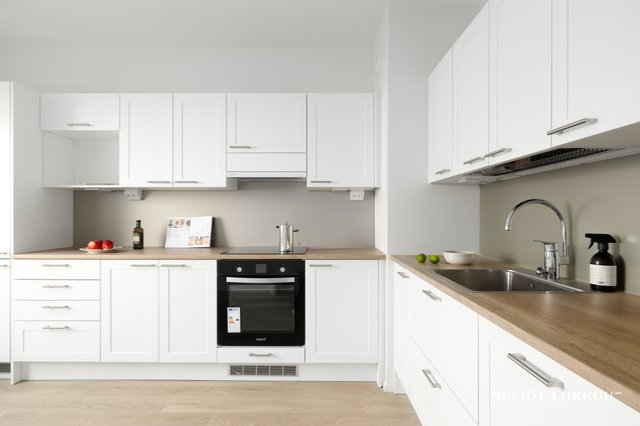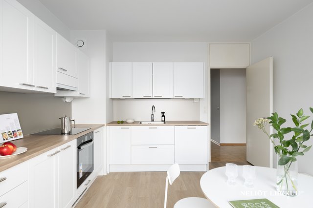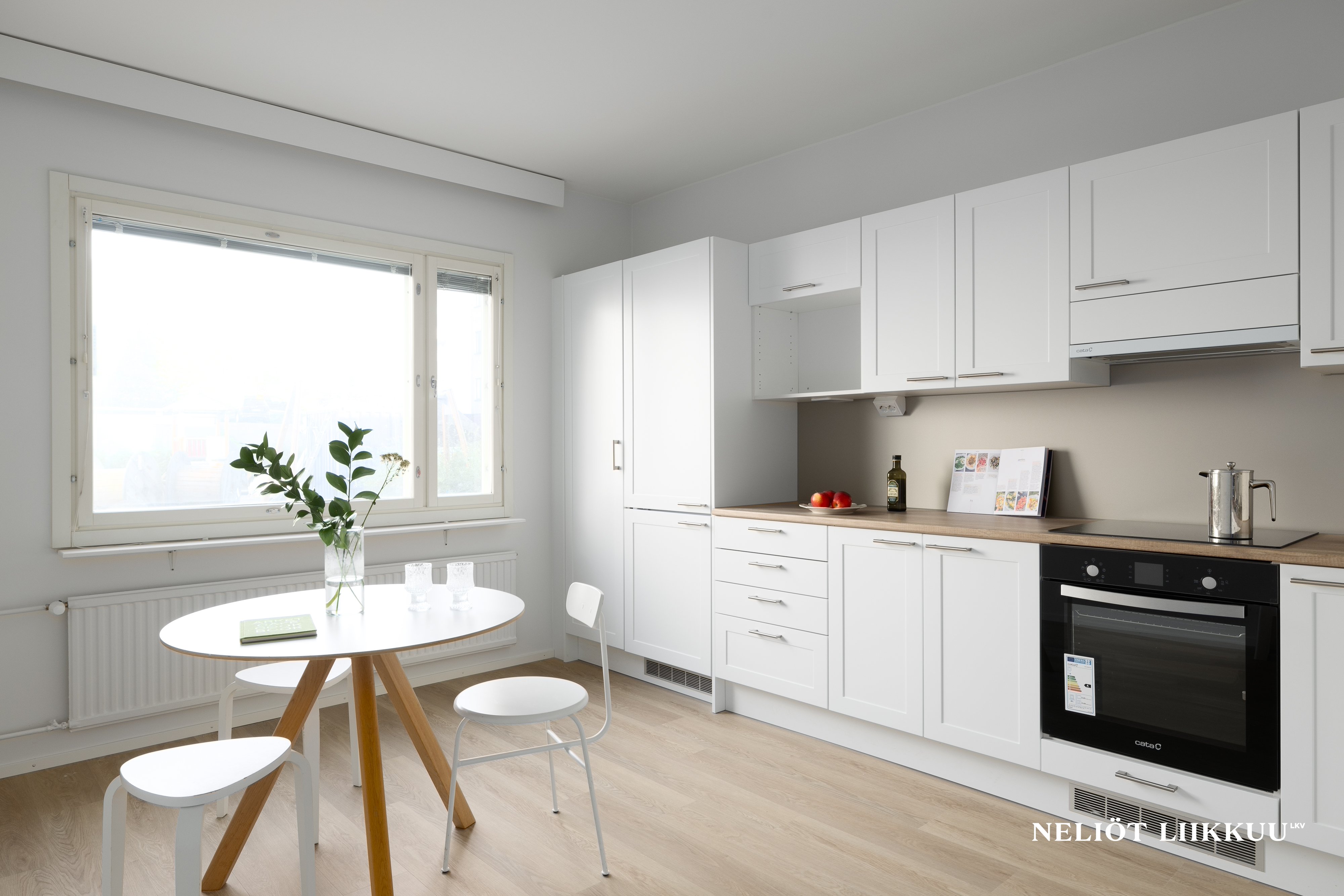 Kodikkaassa juuri remontoidussa keittiössä on integroidut kodinkoneet, paljon lasku- ja kaappitilaa sekä paikka ruokapöydälle, mikä tekee yhdessäolosta helppoa ja mutkatonta. Olohuone avautuu vehreisiin maisemiin ja jatkuu tilavalle parvekkeelle, joka toimii olohuoneen jatkeena puolet vuodesta.