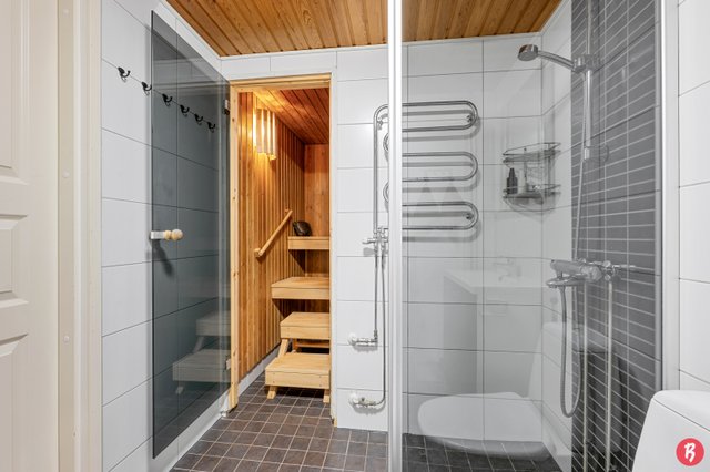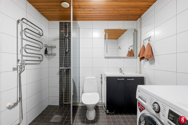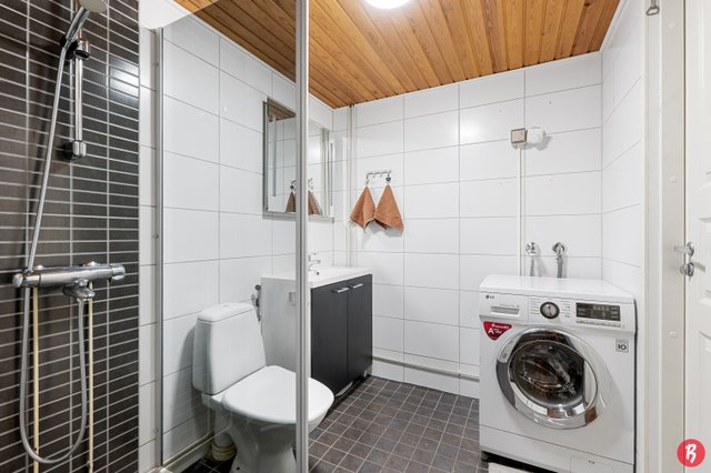 - WC-istuin, suihku, suihkuseinä, pesukoneliitäntä, lattialämmitys, bidee-suihku, allaskaappi, pesuallas, ja peili