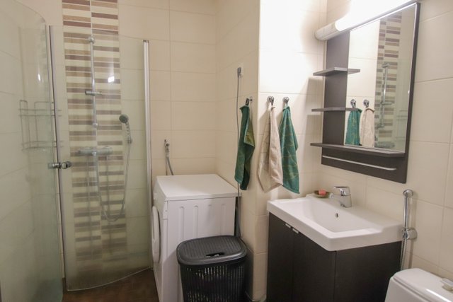 - WC-istuin, suihku, suihkuseinä, pesukoneliitäntä, peili, pesuallas, allaskaappi, ja bidee-suihku