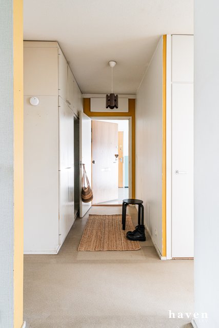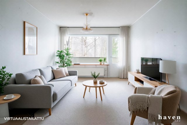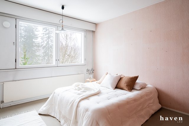 Pohjaratkaisu on toimiva ja huoneet ovat isoja. Kylpyhuone on remontoitu linjasaneerauksen yhteydessä, muuten asunto on peruskuntoinen. Ikkunoista on kivat näkymät taloyhtiöiden sisäpihoille. Lasitettu parveke suuntautuu etelään, iltapäivän auringon puolelle. Säilytystilaa on runsaasti.