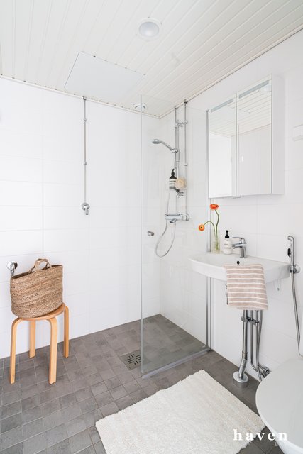- WC-istuin, suihku, suihkuseinä, pesukoneliitäntä, lattialämmitys, peilikaappi, pesuallas, allaskaappi, ja bidee-suihku