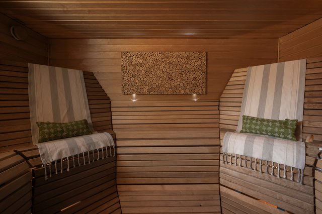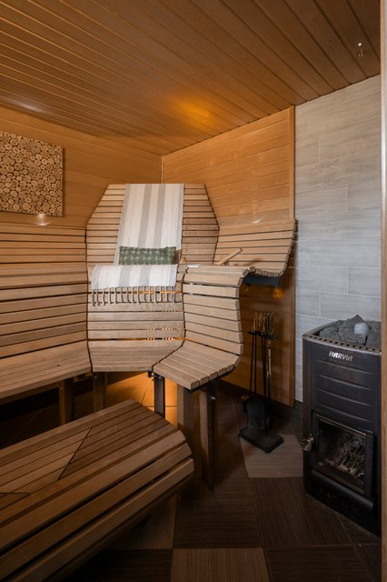 - Tyylikäs ja tilava sauna, jossa on perinteinen puukiuas. LATTIA: laatta SEINÄT: puu