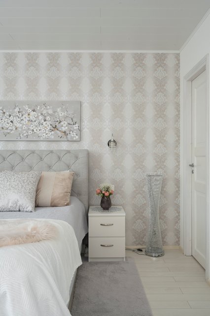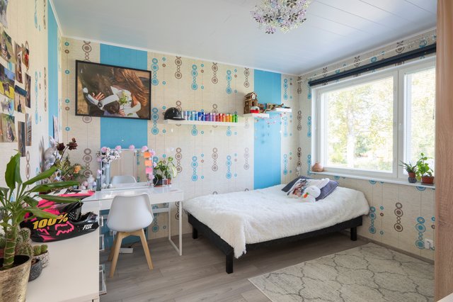 - Kolme hyvänkokoista makuuhuonetta, joista yhden yhteydessä on vaatehuone ja kahdessa on säilytyskaapit. LATTIA: laminaatti SEINÄT: tapetti ja maali