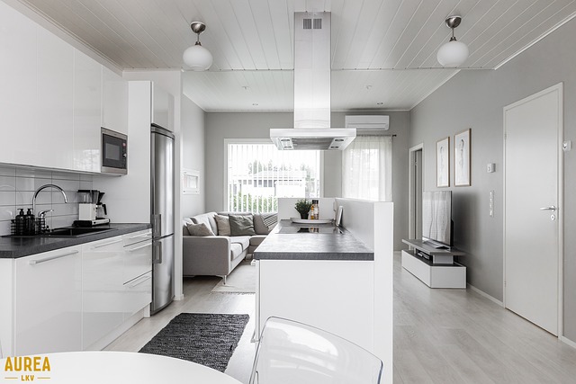 Keittiön ja olohuoneen yhdistelmä on valoisa ja raikas. Kolmeen metriin kipuava huonekorkeus olohuoneessa tekee tilasta erityisen avaran oloisen. Puustellin kalustama, valkoinen keittiö rosterisine kodinkoneineen on kaunis sellaisenaan. Ruokailutila jää käytännöllisesti keittiön toiselle puolelle. Kauttaaltaan vaalea lattia sointuu luontevasti rauhalliseen ja kauniiseen sävymaailmaan.