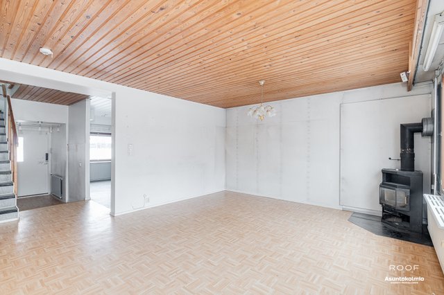 - Olohuoneessa takka ja kulku katetulle terassille ja piha-alueelle.
