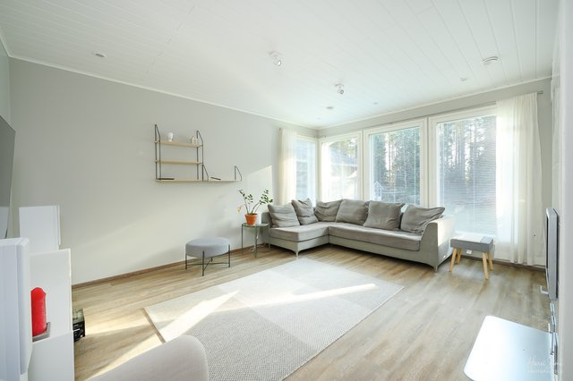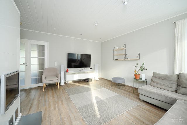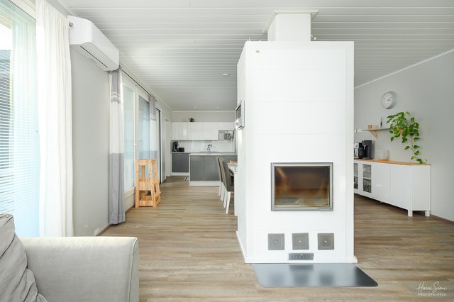 - Valoisa olohuone! Olohuoneen ja ruokailutilan välissä takkaleivinuuni jakavat yhtenäistä tilaa..