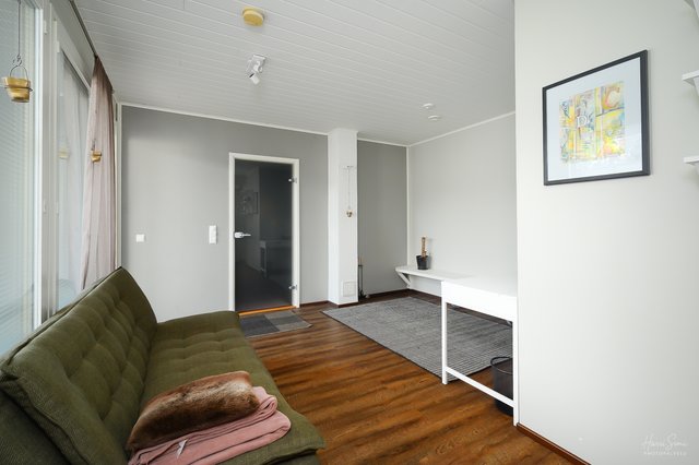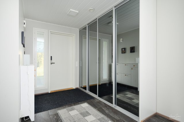 - Eteisessä peililiukuovikaapistot. Saunatuvasta kulku pesutiloihin ja takaterassille. Saunatuvan voit sisustaa mielesi ja käyttötarpeen mukaiseksi. Tuleeko siitä makuuhuone, etätyöpiste vai peli/jumppahuone?