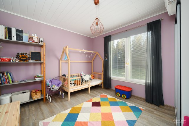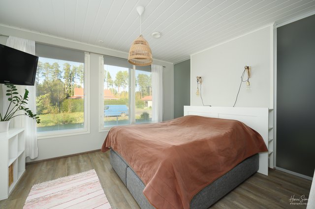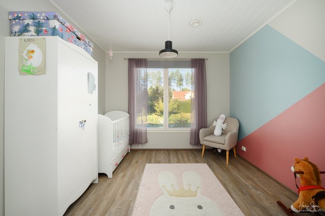 Makuuhuoneita on kolme ja isoimman makuuhuoneen yhteydessä oleva vaate/pukeutumishuone tuo helppoutta vaatesäilytykseen. Käytännöllisessä kodinhoitohuoneessa arjen askareet sujuvat.