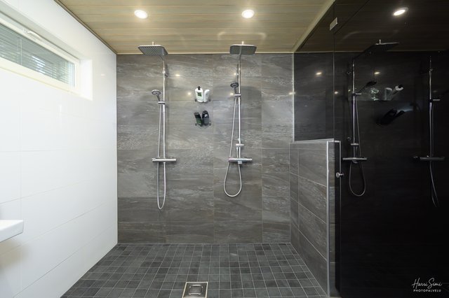 - Tilava pesuhuone. Pesuhuoneessa kaksi suihkua, seinä-wc ja käsienpesuallas. Muuratut seinät laattojen alla.