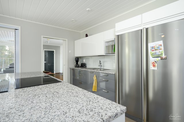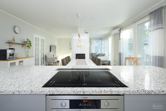- Tilava ja siisti keittiö! Kaappi- ja työtasotilaa on mukavasti. Saarekkeessa kaapistoja ja laaja työtaso. Keittiö, ruokailutila ja olohuone ovat yhtenäistä tilaa, johon takkaleivinuuni antaa lämpöään. Kodinkoneet: Astianpesukone, iso induktioliesitaso, liesituuletin (aktiivihiili), uuni, jääkaappi ja pakastin. .