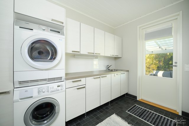 - Käytännöllisessä kodinhoitohuoneessa kaapistoja, työtasoa, allas hanoineen, paikka pyykkitornille, kurapiste ja kulku ulos.