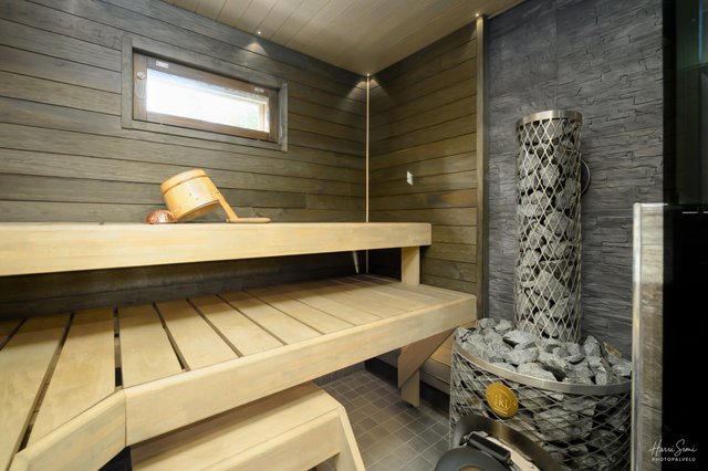 - Siisti sauna puukiukaalla! Kunnon löylyt takaa riittävällä kivimäärällä oleva puukiuas ;) Valaistus ledeillä. Saunassa varaus myös sähkökiukaalle. Saunan ja pesuhuoneen välinen seinä osin lasia.