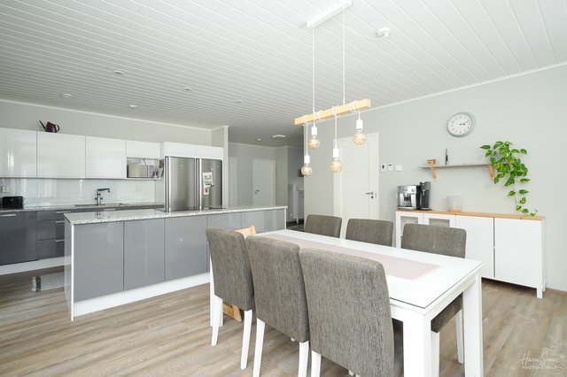 Keittiössä on kaikki sopivasti käden ulottuvilla sekä runsaasti kaappi- ja työtasotilaa. Keittiön saarekkeessa on lisää kaappitilaa, uuni ja leveä induktioliesitaso. Ruokailutilaan saat soviteltua isonkin ruokapöydän helposti.