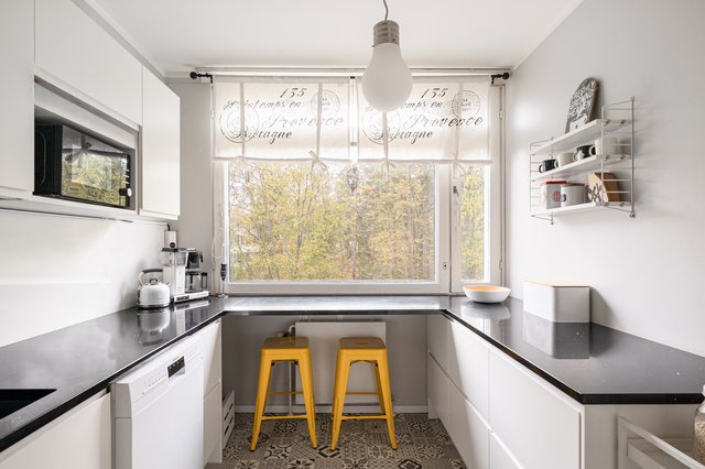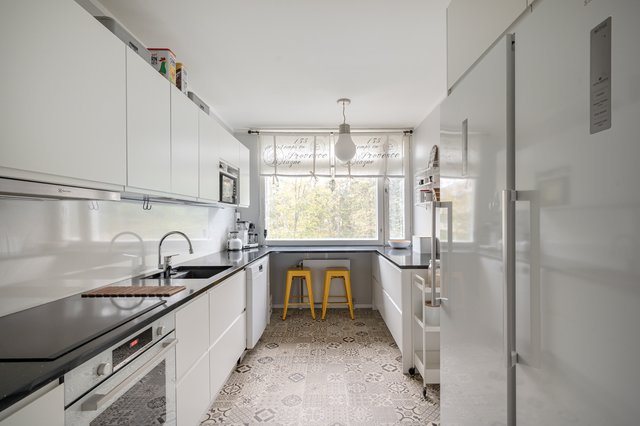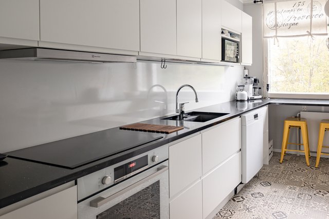 - Klassisen kaunis, valoisa keittiö, jossa runsaasti säilytys- ja työtilaa. Keittiö on remontoitu kauttaaltaan vuosina 2020-21; kaapistot Epoq ja tasot kvartsikomposiitti. Varusteet: täyskorkeat jääkaappi ja pakastin, induktioliesi, liesituuletin, kalusteisiin integroitu uuni, astianpesukone. Lattia vinyylilaatta.