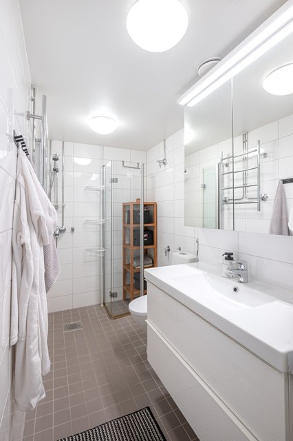 - Kylpyhuone on uusittu kalusteineen linjasaneerauksen yhteydessä. Seinät kaakelia, laattalattia. Varusteet: suihku ja taittuva suihkuseinäke, wc ja bidee, leveä allaskaapisto ja peilikaappi, pyyhekuivain, sähkötoiminen lattialämmitys.