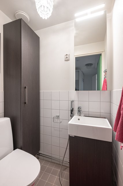 - Varusteet: allaskaappi ja peilikaappi, wc ja bidee. Laattalattia, seinissä osalaatoitus ja maali.
