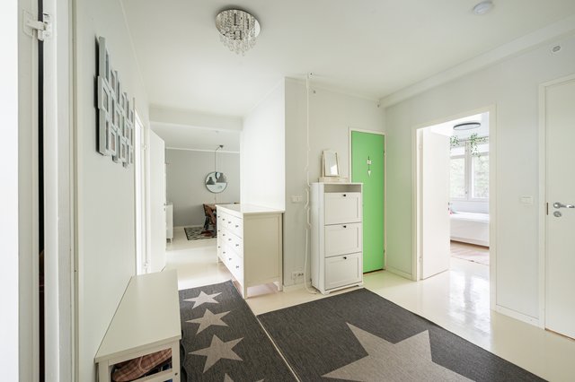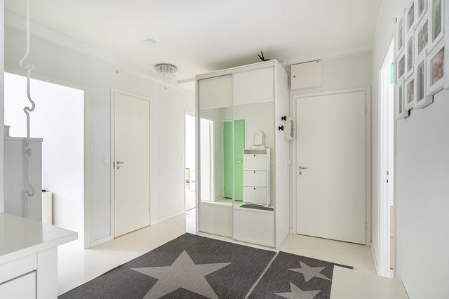 - Tilava eteisaula, jossa liukuovikaapisto ulkovaatteille. Parkettilattia.