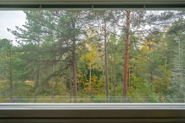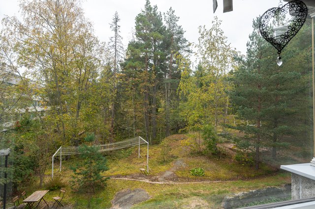 - Läpitalon asunto etelä-pohjois-suunnassa. Molemmin puolin vastassa rauhallinen metsämaisema.