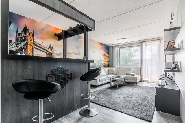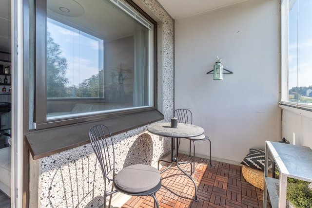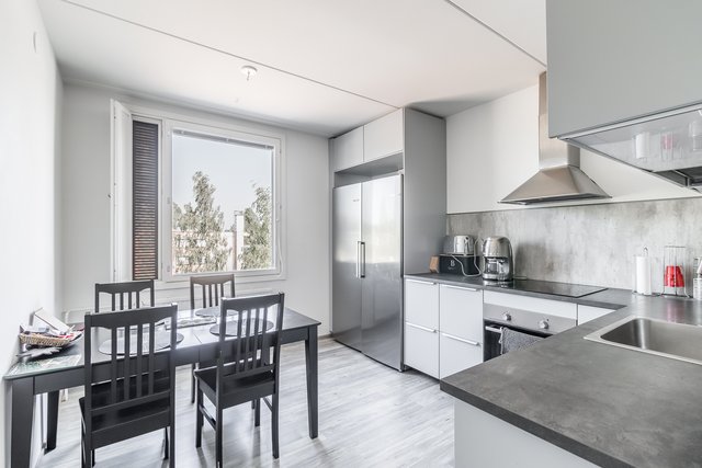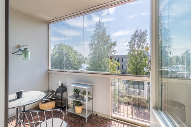 Tyylikäs keittiö on saanut uuden, modernin ilmeen vaaleine pintoineen ja laadukkaine kodinkoneineen. Olohuoneeseen tulvii luonnonvaloa suurista ikkunoista, ja tilasta on käynti suurelle lasitetulle parvekkeelle, joka toimii kesäisin lähes ylimääräisenä huoneena.