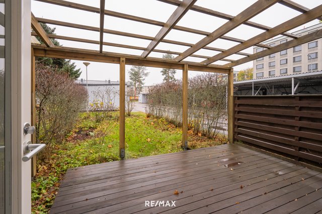 - Asunnon takapihalla terassi. Terassin saa kattaa niin halutessaan valokatteelle, taloyhtiössä tehty päätös materiaalista. Malli löytyy huoneistosta.