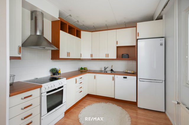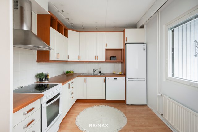 - Erillinen keittiö sijaitsee alakerrassa, siellä on runsaasti kaappitilaa ja työtasoa. VARUSTEET: keraaminen liesi, liesituuletin, jääkaappi/pakastin, astianpesukone LATTIA: laminaatti SEINÄT: maali VÄLITILA: laatta TYÖTASO: laminaatti