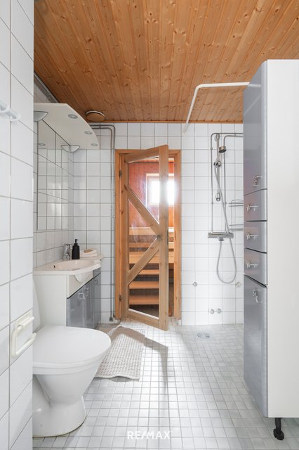 - Tilava pesuhuone, saunan yhteydessä. VARUSTEET: WC-istuin, suihku, verhotanko, pesuallas, peili, pyykkikaappi, seinäkaappi, pesukoneliitäntä LATTIA: laatta SEINÄT: laatta
