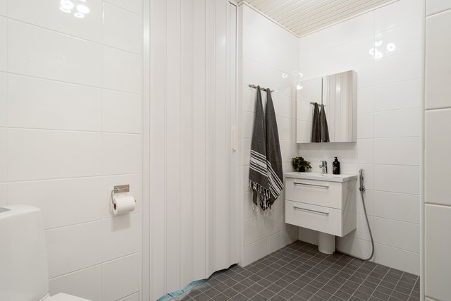 - WC-istuin (Uusittu 2025), suihku, lattialämmitys (Sähköinen ), bidee-suihku, peilikaappi, ja allaskaappi