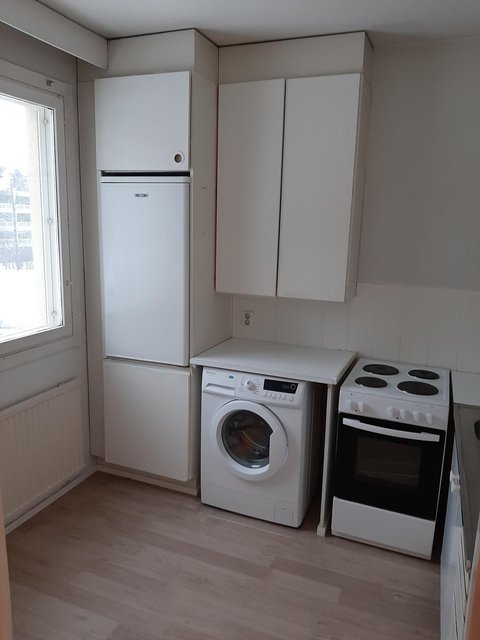 - WC-istuin, suihkukaappi, pesuallas, peili, suihku, ja pesukone (keittiössä)