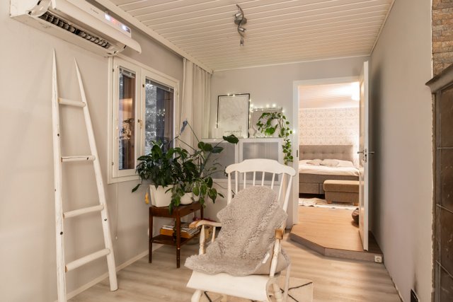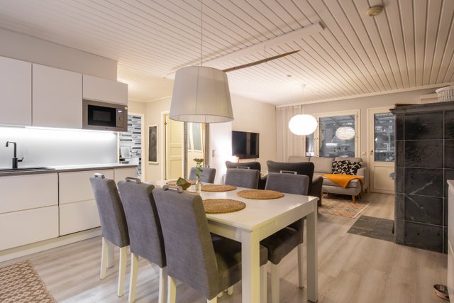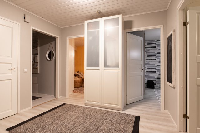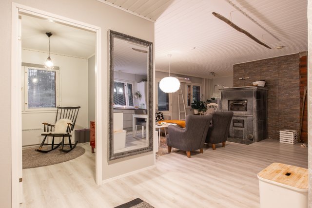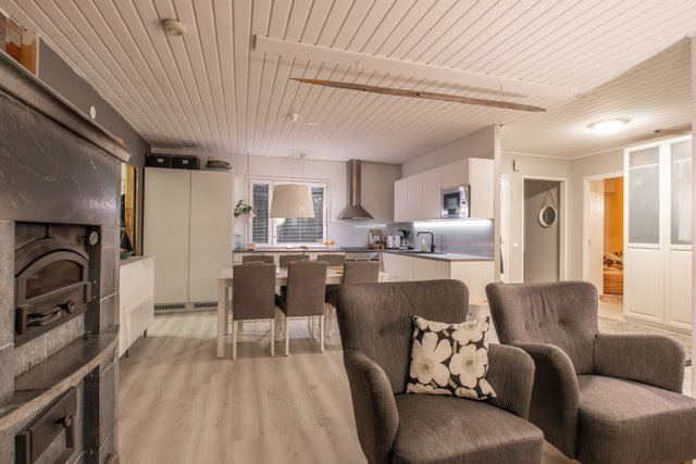 Avaran olohuoneen sydämenä toimii varaava takka, joka luo kodikasta tunnelmaa viileämpinäkin päivinä. Keittiö on remontoitu nykyaikaisilla materiaaleilla ja moderneilla integroiduilla kodinkoneilla. Neljä makuuhuonetta tarjoavat runsaasti tilaa isommallekin perheelle, etätyöhön kuin harrastuksiinkin. Kylpyhuone ja sauna on uusittu samaan aikaan keittiön kanssa, ja niiden raikas, moderni ilme kutsuu rentoutumaan. Kodinhoitohuoneen yhteydessä sijaitsee käytännöllinen arkieteinen, jossa lattialämmitys lisää arjen mukavuutta.