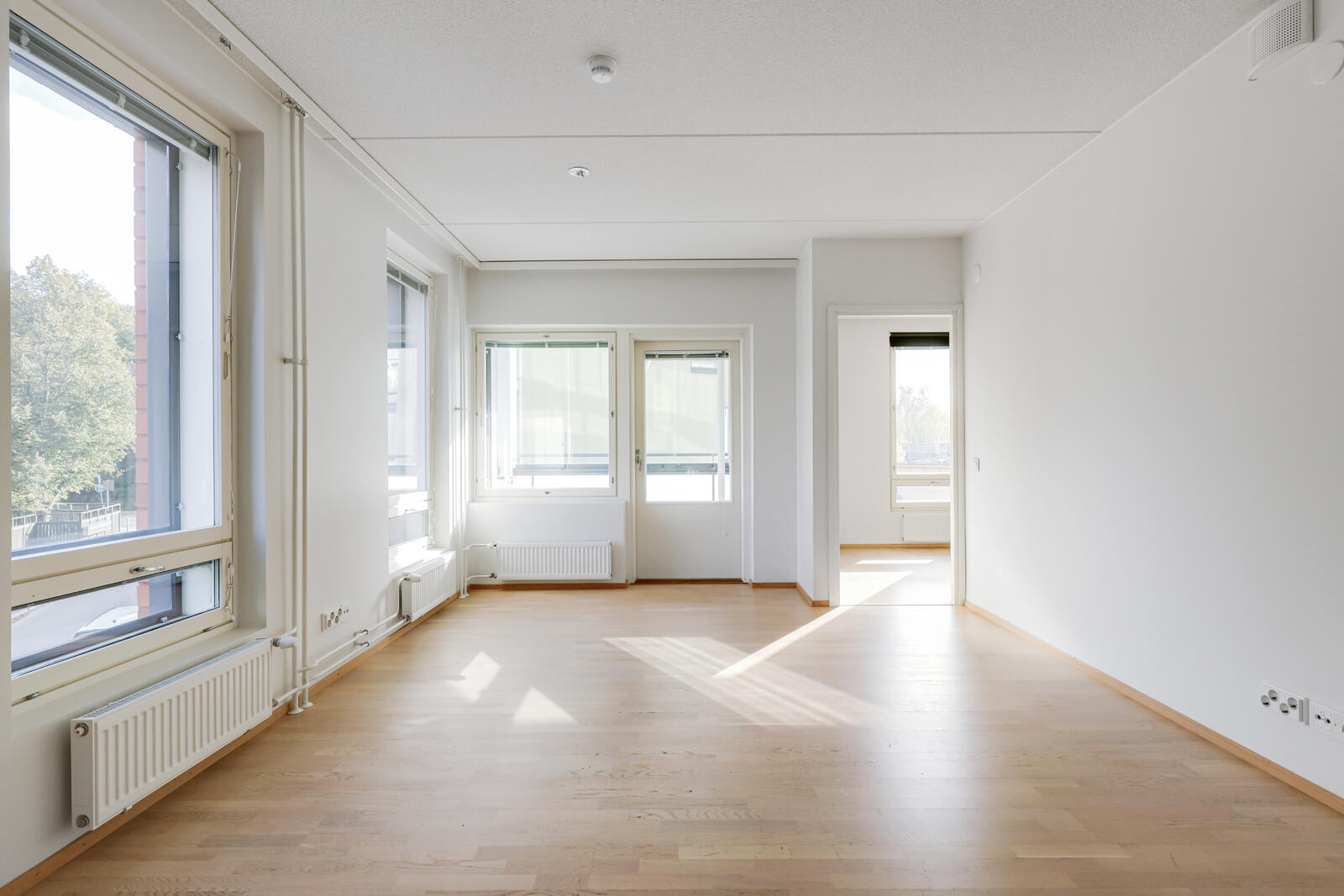 Olohuone on mukavan tilava ja sen jatkeena on eteisen päässä saarekkeellinen avokeittiö ja makuuhuoneen päässä lasitettu parveke. Makuuhuoneessa ja eteisessä on hyvin säilytyskaappeja valmiina ja saunallisessa kylpyhuoneessa on tilaa pyykinpesukoneelle. Asunnon olohuoneesta on puistomaiset näkymät Juustenintielle.