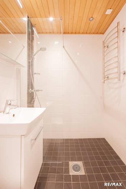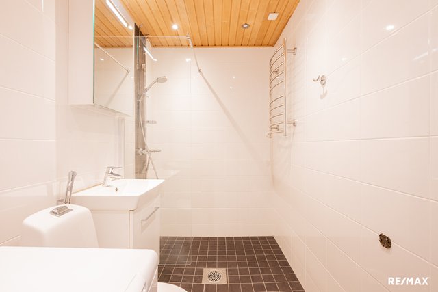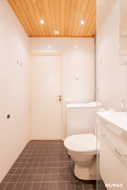- WC-istuin, suihku, suihkuseinä, pesukoneliitäntä, pesuallas, allaskaappi, ja peilikaappi