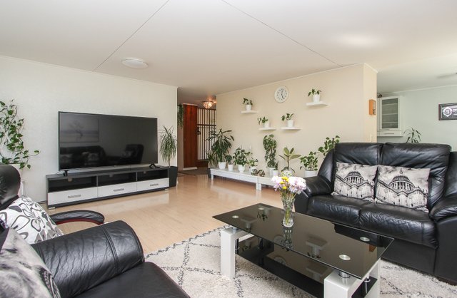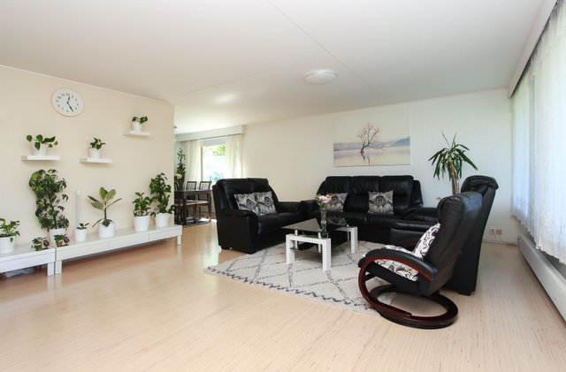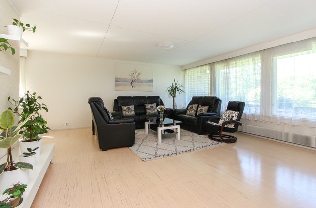 - Suuri olohuone, jossa koivuparkettilattia ja seinäpinnat tapetoitu. Parketti hiottu ja tapetit uusittu 2021. Käynti parvekkeelle.