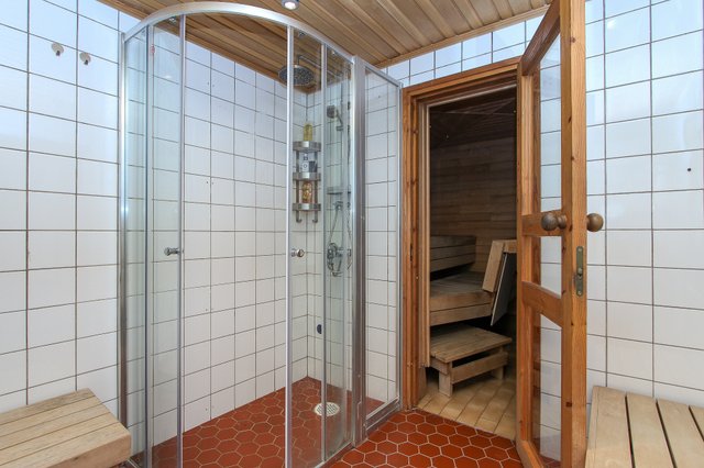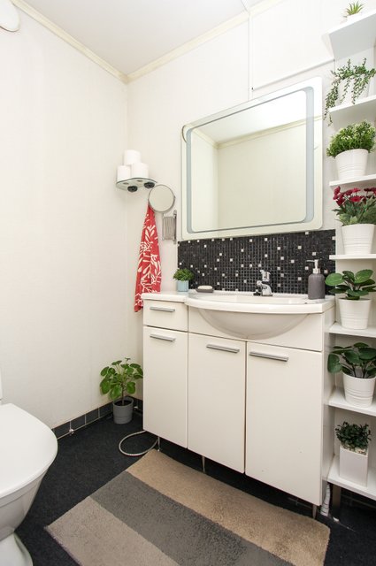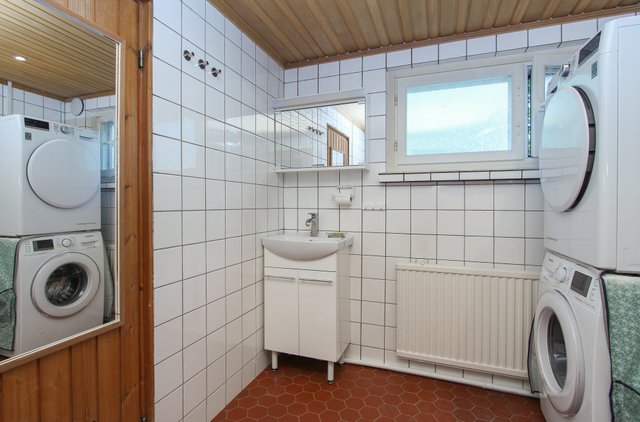 - Suihku, suihkuseinä, allas, allaskaappi, peilikaappi, pesukoneliitäntä. Lattiassa ja seinissä on alkuperäinen laatoitus, katto on uusittu 2008.