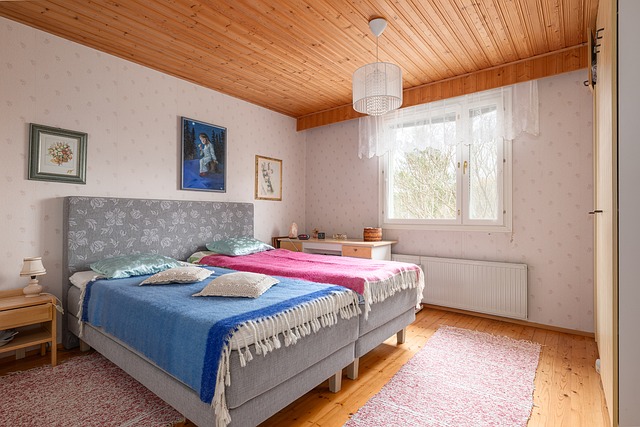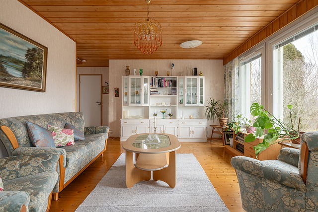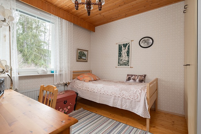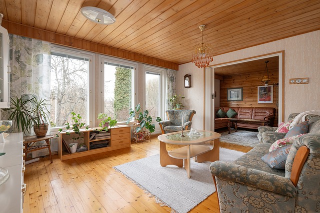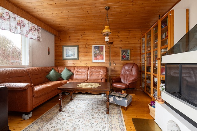 - Leveä paneeli päätyseinässä, ikkunaseinä tapettia, rapattu seinä missä on takka.