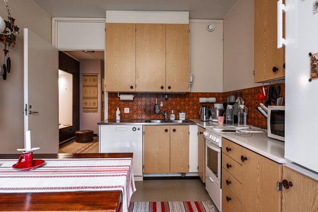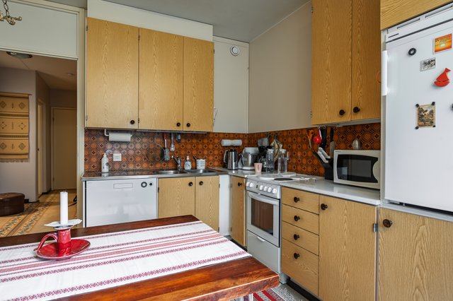 - Jääkaappi, uuni, astianpesukone. Keittiössä mukavasti kaappitilaa ja pöytä mahtuu ikkunan ääreen. Keittiö alkuperäinen mutta siisti.
