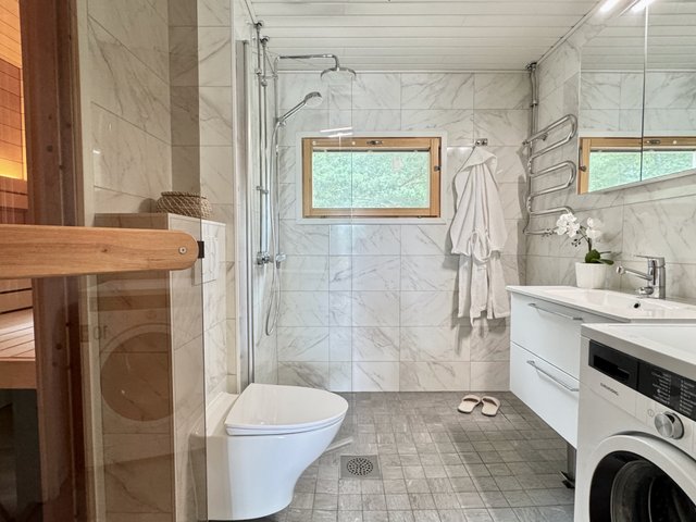 - 2023 Yläkerran kylpyhuone remontoitu täysin. Varusteet: Seinä-WC, Pesuallas ja Allaskaappi, Peilikaappi, Suihku ja Suihkuseinä, Pesukoneliitäntä, Lattialämmitys, Lattia laattaa ja seinät kaakelia.