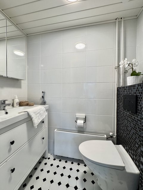 - 2025 WC remontoitu täysin. Varusteet: Seinä-WC, pesuallas ja allaskaappi, peilikaappi, bidee, uusittu patteri. Lattia laattaa ja seinät kaakelia.