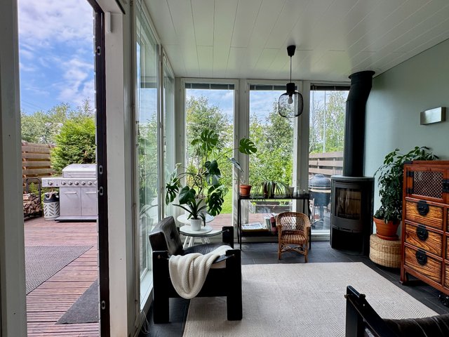 Ensimmäinen kerros hurmaa avaralla ja valoisalla oleskelutilallaan, jossa yhdistyvät olohuone, ruokailutila ja moderni keittiö. Keittiössä on laadukkaat kodinkoneet, runsaasti säilytystilaa ja kauniit vaaleat tasot. Ruokailutilasta on käynti viihtyisälle viherhuoneeseen, jossa myös talvella kelpaa rentoutua takkatulen lämmössä.