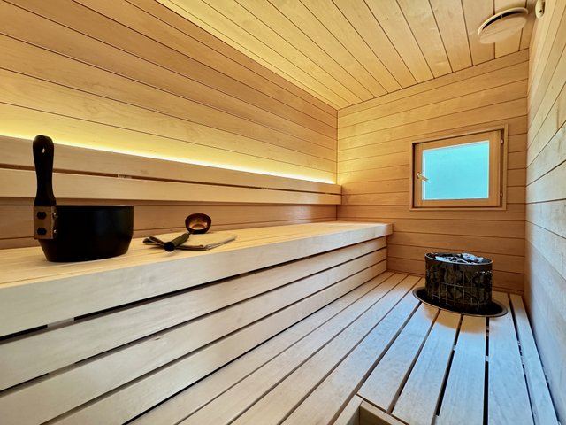 - 2023 Sauna remontoitu. Sähkökiuas, lattia laattaa ja seinät puuta.