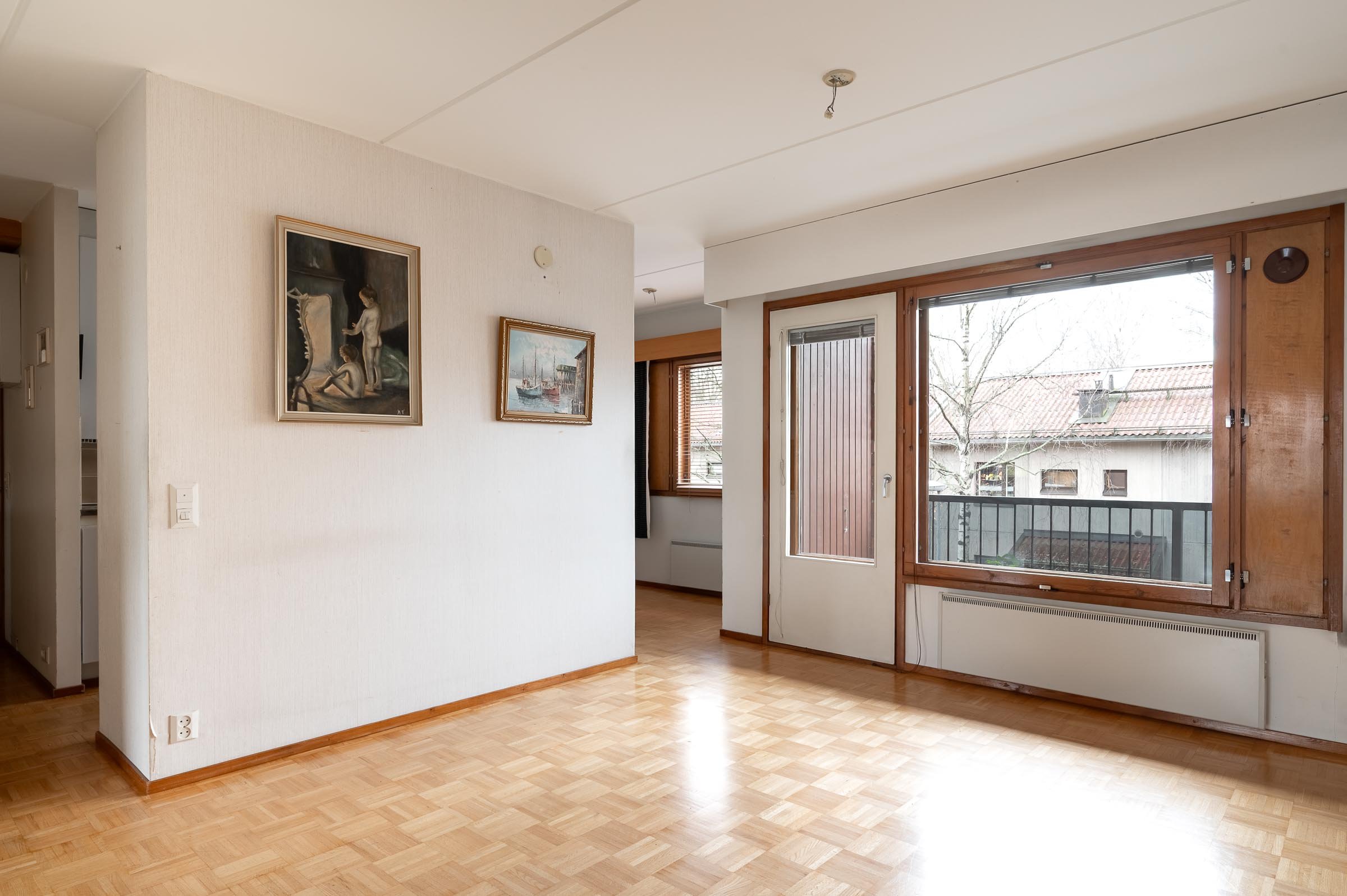 - Olohuoneen ikkunat n. länteen. Olohuoneesta on käynti parvekkeelle. Lattia mosaiikkiparketti ja seinät tapetoitu.