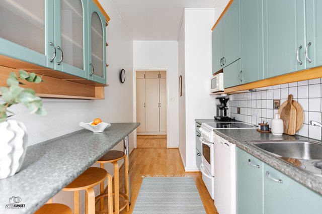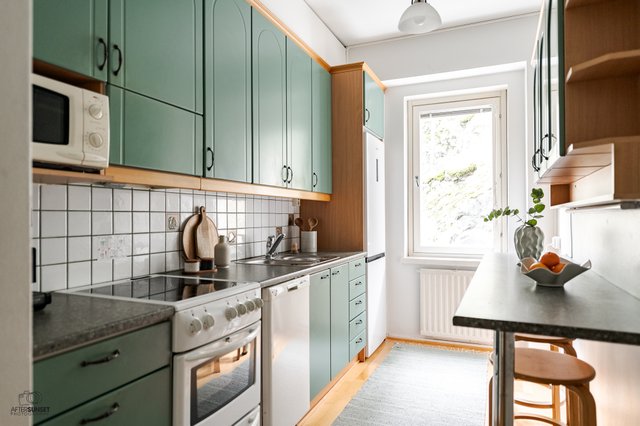 - Jääkaappi/pakastin, astianpesukone, keraaminen liesi, kaapistot.