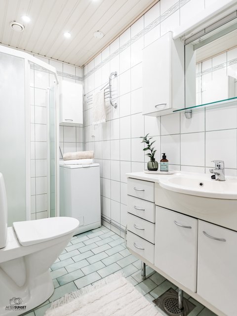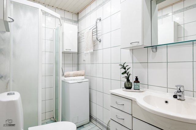 - Suihku, suihkuseinä, pesukoneliitäntä, pesukone, wc-istuin, bidee-suihku, allaskaapisto, peili, kaappi.