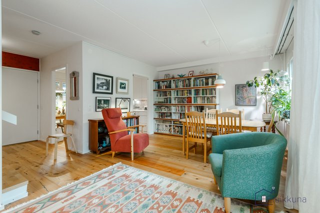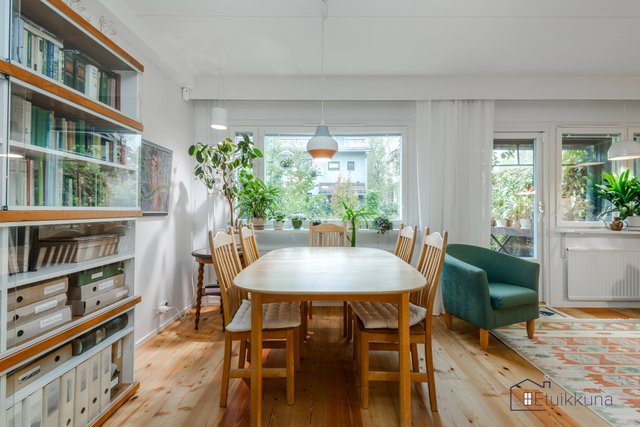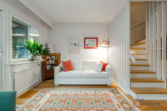 - Mukavan kokoinen olohuone tarjoaa tilan niin sohva- kuin myös suuremmalle ruokaryhmälle. Viihtyisä ja todella valoisa tila suuntaa rajatulle ja kauniisti hoidetulle pihalle. Vuonna 2021 yhtiössä on uusittu ikkunat, joiden valkeat pokat tuovat keveyttä tilaan. Olohuoneesta on kulku katetulle terassille ja pihalle.