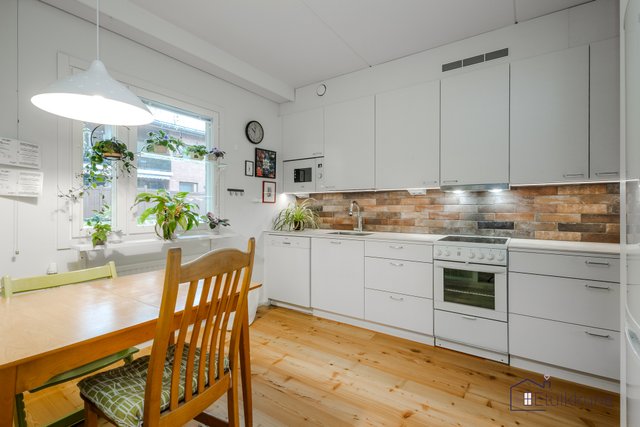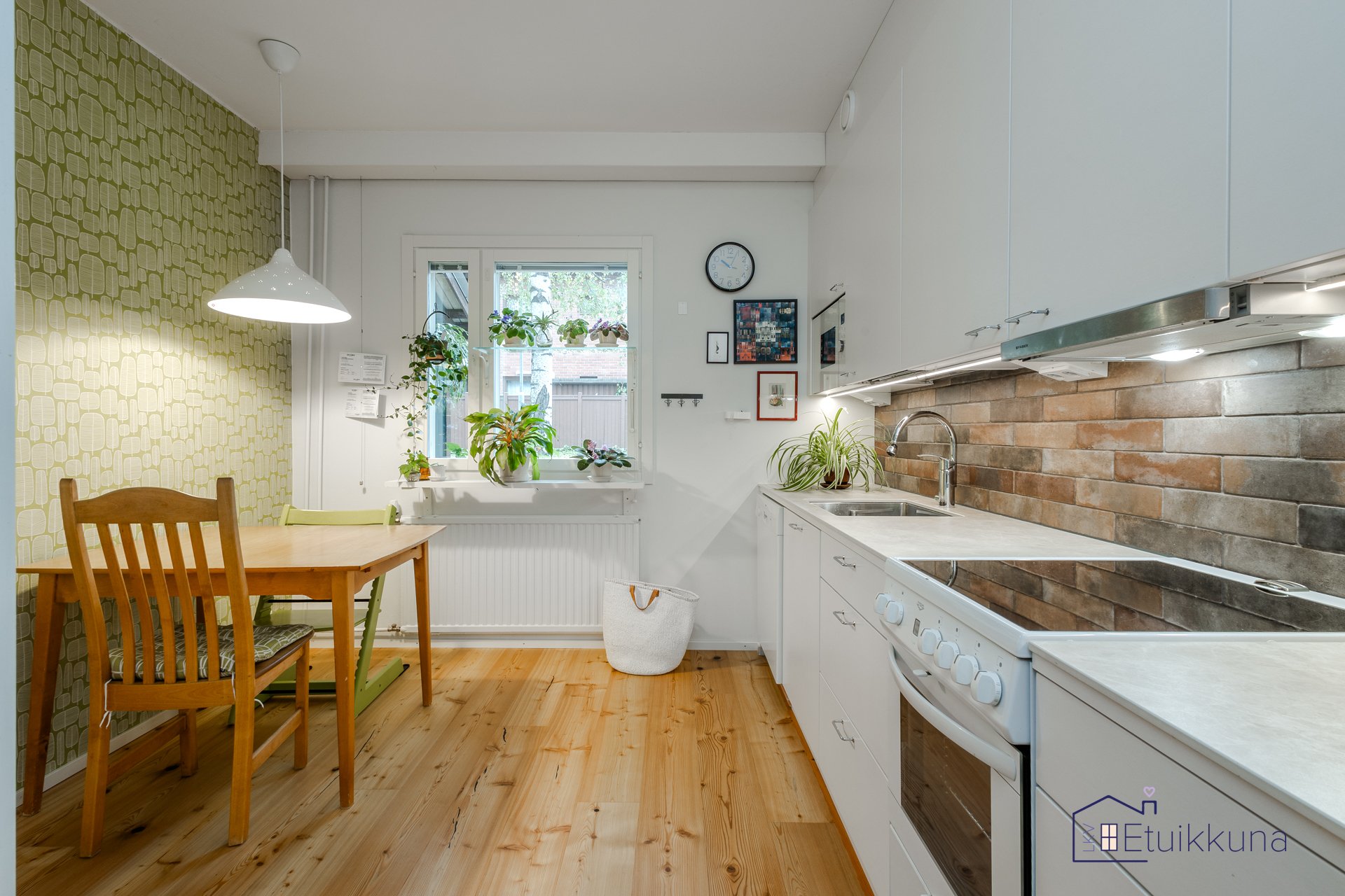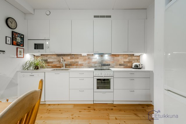 - Kaunis ja toiminnallinen Puustellin keittiö on remontoitu vuonna 2021. Laadukas lehtikuusi lautaparkettilattia on uusittu vuonna 2023. Remontin yhteydessä toimivia kodinkoneita ei uusittu lukuun ottamatta integroitua mikroaaltouunia. Vaaleiden seinien rinnalla on kauniilla tapetilla viimeistelty tehosteseinä sekä välitilan tyylikäs laatta, jotka tarjoavat kotikokille viihtyisän ympäristön. Keittiön varustukseen kuuluu keraaminen liesi, liesituuletin, jääkaappipakasti, astianpesukone ja integroitu mikroaaltouuni. Työtaso on helposti puhtaana pidettävä keraamitaso. Tilaan mahtuu mukavasti neljän hengen ruokaryhmä.