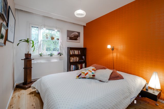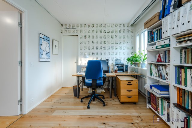 - Huoneiston kaksi makuuhuonetta sijaitsevat yläkerrassa. Huoneet ovat hyvän kokoiset ja soveltuvat kumpainenkin päämakuuhuoneiksi. Tällä hetkellä suurempi huoneista on työ- ja vierashuone käytössä. Tämän huoneen päätyyn on aikaisemman omistajan toimesta rakennettu vaatehuone.