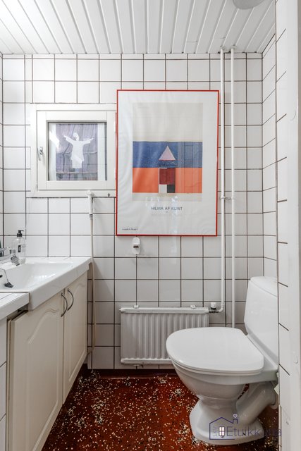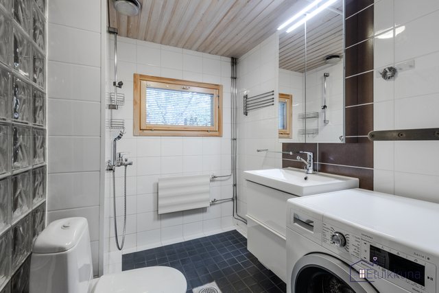 - Pesutilat sijaitsevat huoneiston toisessa kerroksessa. Ne on remontoitu edellisen omistajan toimesta ennen vuotta 2012. Kylpyhuoneen tyylikkäät kalusteet sekä kylpytilan ja saunan välinen lasitiili tuovat viihtyisyyttä ja toiminnallisuutta tilaan. Mukavan kokoinen ikkuna niin pesuhuoneen kuin saunankin puolella tuovat tilaan toivottua luonnonvaloa. Tilassa on peili- ja allaskaappi, suihku, WC-istuin sekä pesukoneliitäntä.