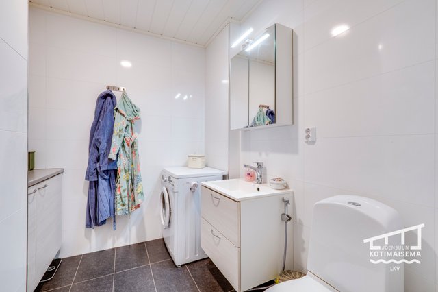 - Pesukoneliitäntä, lattialämmitys, pöytätaso, ja tila pesutornille