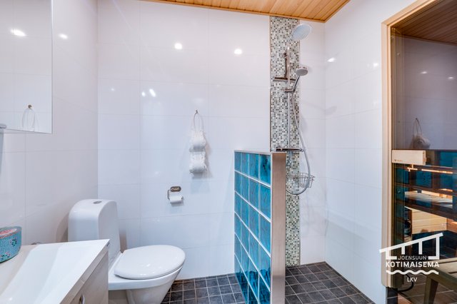 - WC-istuin, suihku, suihkuseinä (Lasitiiliseinäke), bidee-suihku, allaskaappi, peilikaappi, pesuallas, ja lattialämmitys