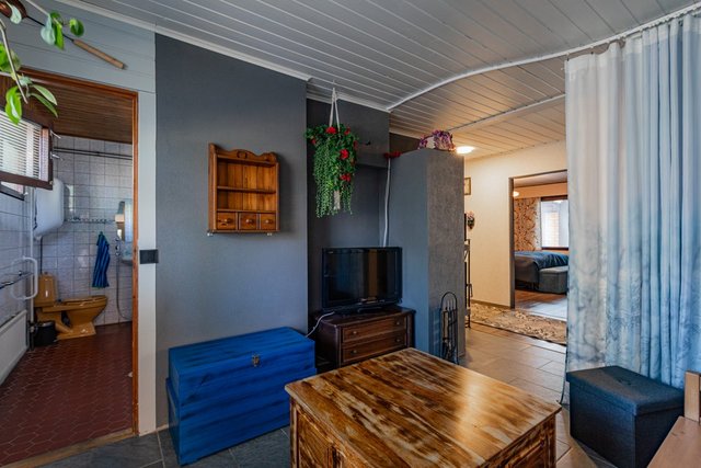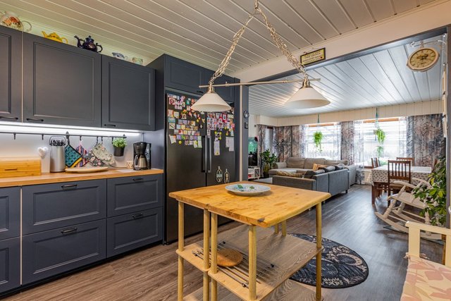 Keittiö on varustettu uusilla kodinkoneilla, kuten jääkaapilla, pakastimella ja astianpesukoneella, mikä tekee arjesta sujuvaa. Olohuoneessa on runsaasti luonnonvaloa, ja takkahuoneessa oleva varaava takka leivinuunilla luo tunnelmaa kylminä talvi-iltoina.