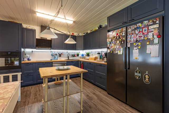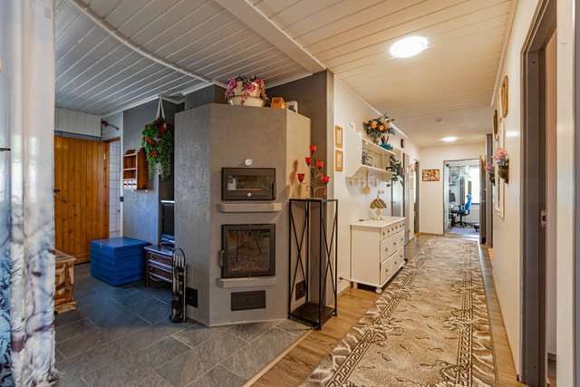 The kitchen is equipped with new appliances, including a refrigerator, freezer, and dishwasher, ensuring smooth everyday living. The living room is filled with natural light, and the heat-retaining fireplace with a built-in baking oven in the lounge area creates a warm and cozy atmosphere on cold winter evenings.